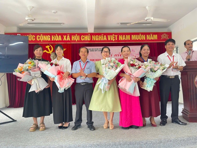 Thay mặt cho nam công nhà trường, thầy giáo Nguyễn Đức Tính và thầy Phạm Văn Phú – Phó hiệu trưởng đã gửi tặng đến các cô giáo, cán bộ, nhân viên nữ bó hoa tươi thắm thay cho lời chúc mừng, lời tri ân sâu sắc đến các phái đẹp của nhà trường.