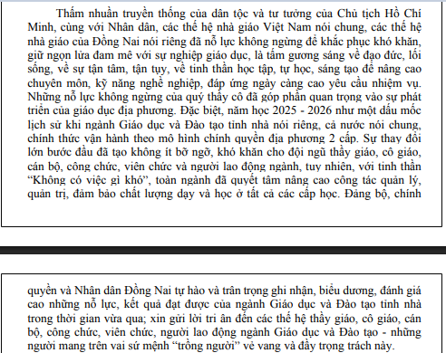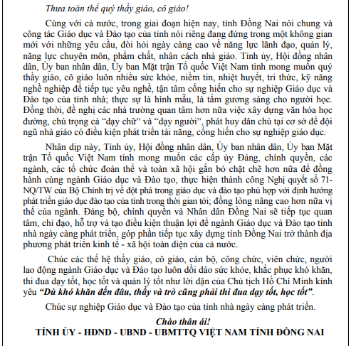 THƯ CHÚC MỪNG của Tỉnh ủy, Hội đồng nhân dân, Ủy ban nhân dân, Ủy ban Mặt trận Tổ quốc Việt Nam tỉnh Đồng Nai nhân dịp kỷ niệm 43 năm ngày Nhà giáo Việt Nam