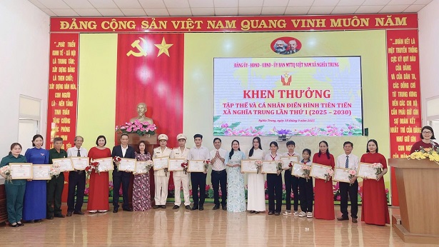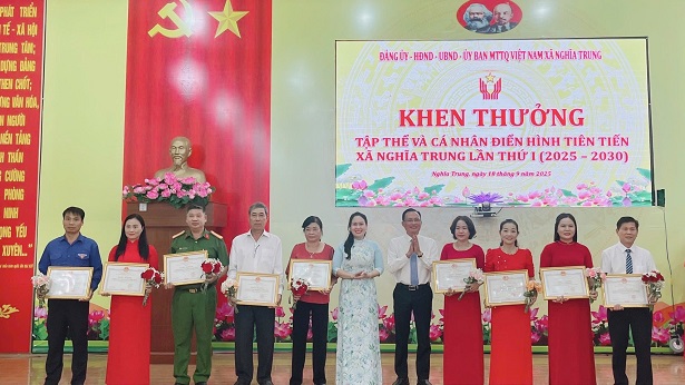 Sáng 18/9, Đảng uỷ, HĐND, UBND, UBMTTQVN xã Nghĩa Trung tổ chức Hội nghị tuyên dương gương điển hình tiên tiến lần thứ I, giai đoạn 2025-2030. Dự hội nghị có đồng chí Võ Thị Anh Đào – Bí thư Đảng uỷ, Chủ tịch HĐND xã; đồng chí Nguyễn Văn Lưu – Phó Bí thư, Chủ tịch UBND xã, Chủ tịch Hội đồng thi đua khen thưởng, chủ trì hội nghị; Đồng chí Trần Văn Vĩnh – UVBTV, Chủ tịch UBMTTQVN xã, đồng chủ trì hội nghị; cùng dự hội nghị có các đồng chí trong Ban thường vụ Đảng uỷ, Ban chấp hành Đảng bộ xã; lãnh đạo các ban, ngành, đoàn thể xã, Ban giám hiệu các trường học trên địa bàn xã. Đây là dịp để ghi nhận, khích lệ tinh thần phấn đấu, đồng thời nhân rộng những tấm gương sáng, tạo sức lan tỏa mạnh mẽ trong cộng đồng.