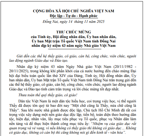 THƯ CHÚC MỪNG của Tỉnh ủy, Hội đồng nhân dân, Ủy ban nhân dân, Ủy ban Mặt trận Tổ quốc Việt Nam tỉnh Đồng Nai nhân dịp kỷ niệm 43 năm ngày Nhà giáo Việt Nam