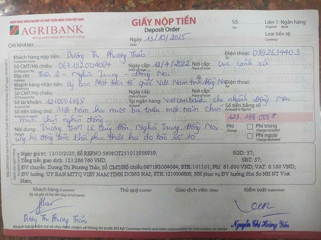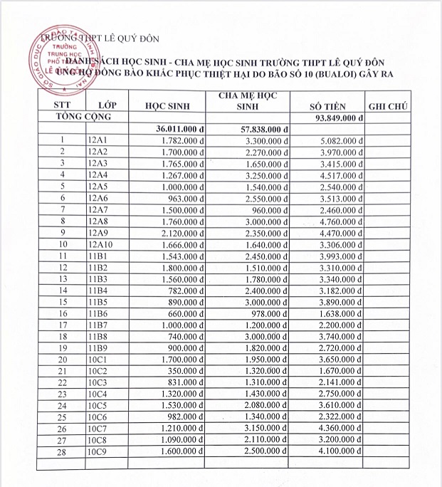 Tổng số tiền đã vận động được là 124.299.000đ (Một trăm hai mươi tư triệu hai trăm chín mươi chín ngàn đồng) trong đó có 3 thầy cô chuyển khoản trực tiếp vào tài khoản của UBMTTQVN, nhà trường đã chuyển toàn bộ số tiền còn lại vào tài khoản của UBMTTQVN tỉnh Đồng Nai để có thể gửi đến tay đồng bào miền Bắc và miền Trung thân yêu.