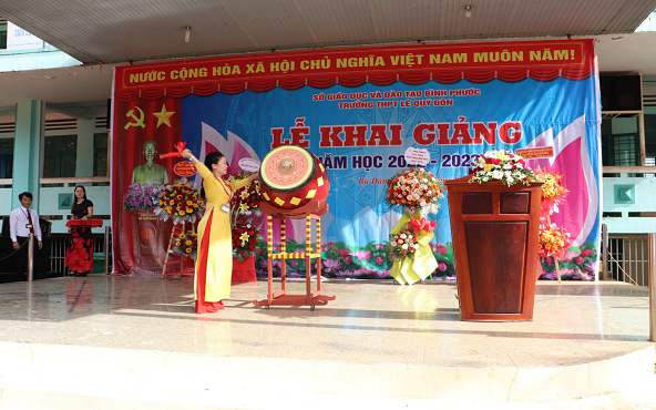 Cô Lê Thị Bích Hạnh - Bí thư Chi bộ - Hiệu trưởng Nhà trường đọc diễn vănkhai mạc và đánh trống khai trường năm học 2022 - 2023