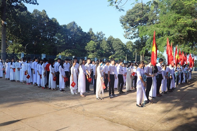 Lễ khai giảng diễn ra với sự tham gia đầy đủ của hơn 1.000 học sinh, toàn thể thầy cô giáo, đại diện lãnh đạo tỉnh Bình Phước, lãnh đạo huyện Bù Đăng, lãnh đạo của các xã Nghĩa Trung, Nghĩa Bình, Đức Liễu, Ban đại diện cha mẹ học sinh.