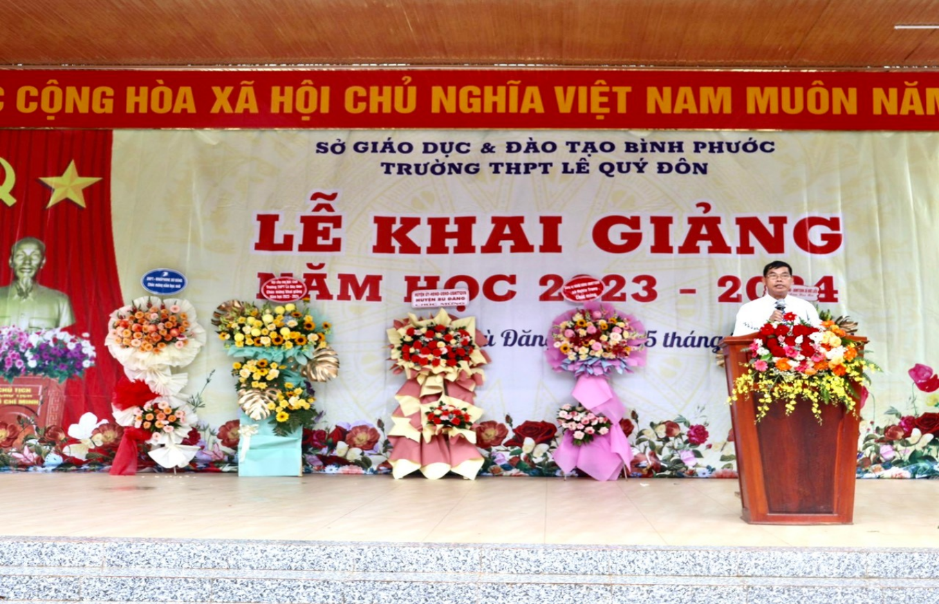 Thay mặt cho lãnh đạo Huyện, đồng chí (Đ/C) Nguyễn Tấn Hồng - Phó bí thư thường trực Huyện ủy, Chủ tịch hội đồng nhân dân huyện Bù Đăng đã đọc thư chúc mừng của Chủ tịch nước Võ Văn Thưởng đến toàn thể cán bộ, giáo viên, học sinh nhân ngày khai trường, động viên, khích lệ cán bộ, giáo viên, học sinh hoàn thành tốt nhiệm vụ năm học 2023 - 2024. Thay mặt huyện ủy, ủy ban nhân dân huyện Bù Đăng, Đ/C Phó Bí thư thường trực Huyện ủy cũng động viên thầy và trò Nhà trường phát huy những thành tích đã đạt được để lập nhiều thành tích hơn nữa trong năm học mới.