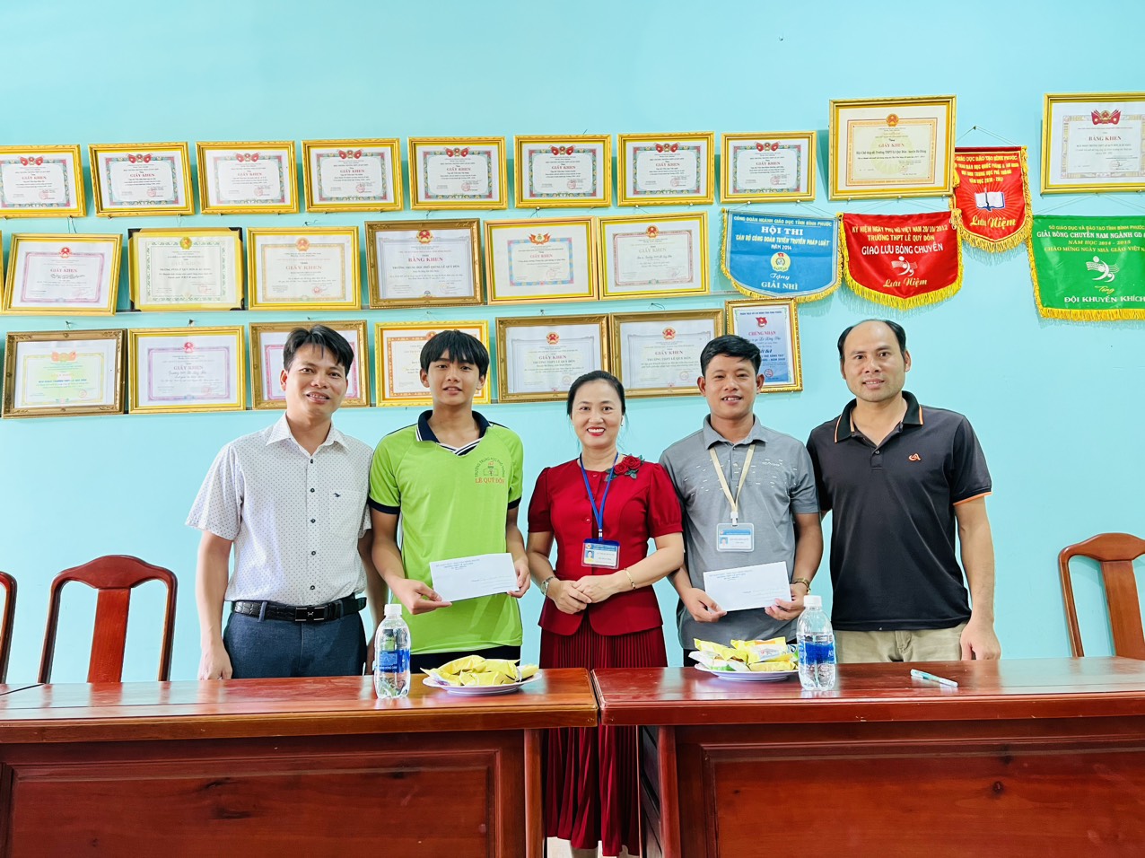 Em Hoàng Sơn Tùng – 11B3 chụp hình cùng Ban giám hiệu nhà trường (cô Lê Thị Bích Hạnh – Hiệu trưởng, thầy Phạm Văn Phú – Hiệu phó), Tổ trưởng tổ TDQP thầy Đặng Quang Quyết, thầy hướng dẫn Nguyễn Đình Quốc.