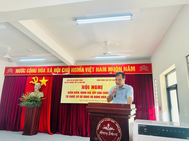 Phát biểu chỉ đạo tại cuộc họp, đồng chí Phan Minh Lâm, UVBTV Đảng ủy – PCT UBND xã Nghĩa Trung đánh giá cao sự chỉnh chu trong công tác chuẩn bị cho buổi kiểm điểm, đánh giá và tinh thần làm việc nghiêm túc, thẳng thắn góp ý cho tập thể, cá nhân các đồng chí trong Chi bộ cũng như những kết quả mà Chi bộ và nhà trường đã đạt được trong năm 2025. Đồng chí mong muốn Chi bộ sẽ tiếp tục sát sao, chỉ đạo các hoạt động của nhà trường để phát huy các thành tích đã đạt được và khắc phục các hạn chế, đưa trường THPT Lê Quý Đôn ngày càng phát triển.