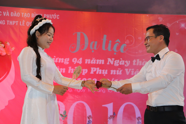 Khen thưởng các tiết Hội giảng Tại buổi dạ tiệc đại diện Ban Giám hiệu, Ban Chấp hành Công đoàn đã gửi lời chúc, những bó hoa tươi thắm dành tặng đến 44 nữ cán bộ, giáo viên và nhân viên nhà trường. Buổi dạ tiệc diễn ra các hoạt động sôi nổi như trò chơi đố vui, hoạt động khi người đàn ông vào bếp, đặc biệt là Hội thi “Người giáo viên thanh lịch” gồm 2 phần thi, biểu diễn trang phục dạ hội và phần thi năng khiếu đã có sự tham gia của 8 cặp đôi. Hội thi đã mang đến nhiều tiết mục sôi nổi, hấp dẫn thể hiện được sự năng động, sáng tạo và nhiệt huyết của thầy giáo, cô giáo.