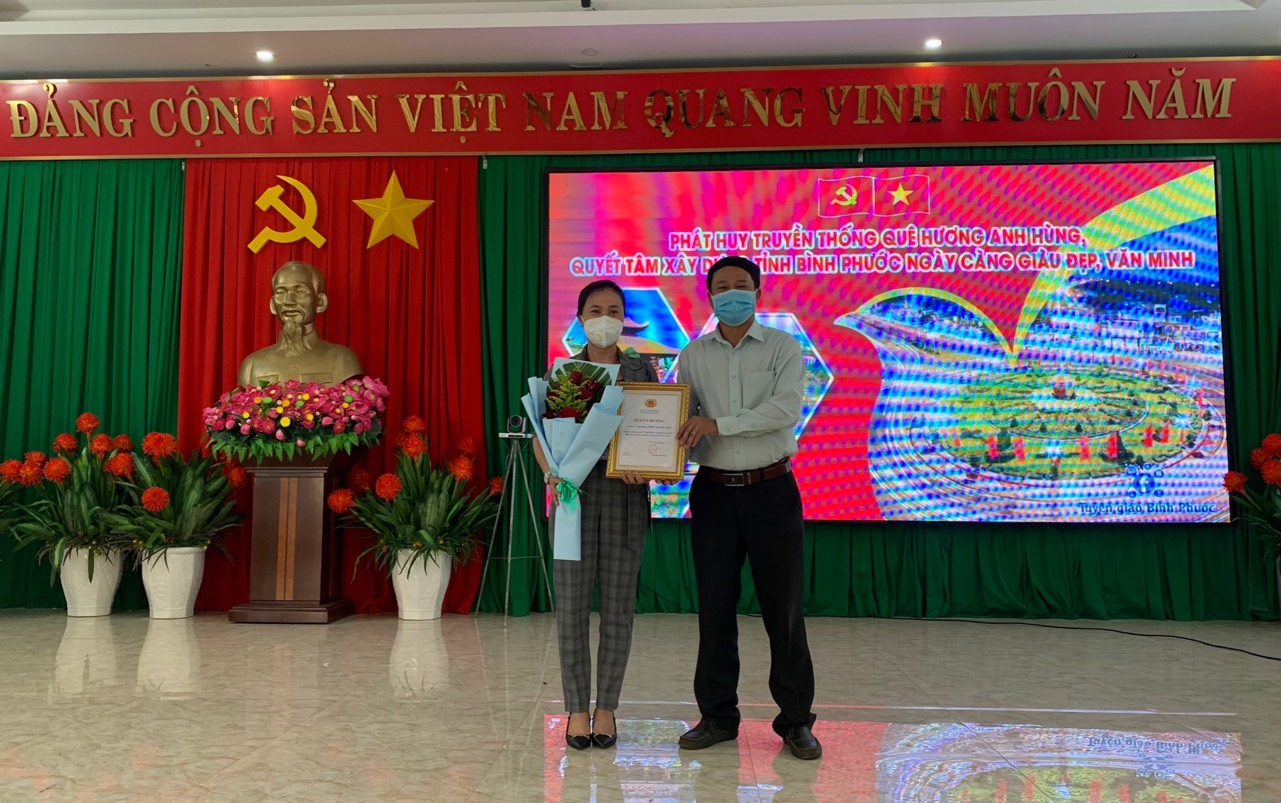 Cô Lê Thị Bích Hạnh - Bí thư chi bộ, Hiệu trưởng nhà trường nhận giấy khen từ đ/c Nguyễn Hoàng Giang-UVBTV, trưởng ban tuyên giáo huyện ủy trao