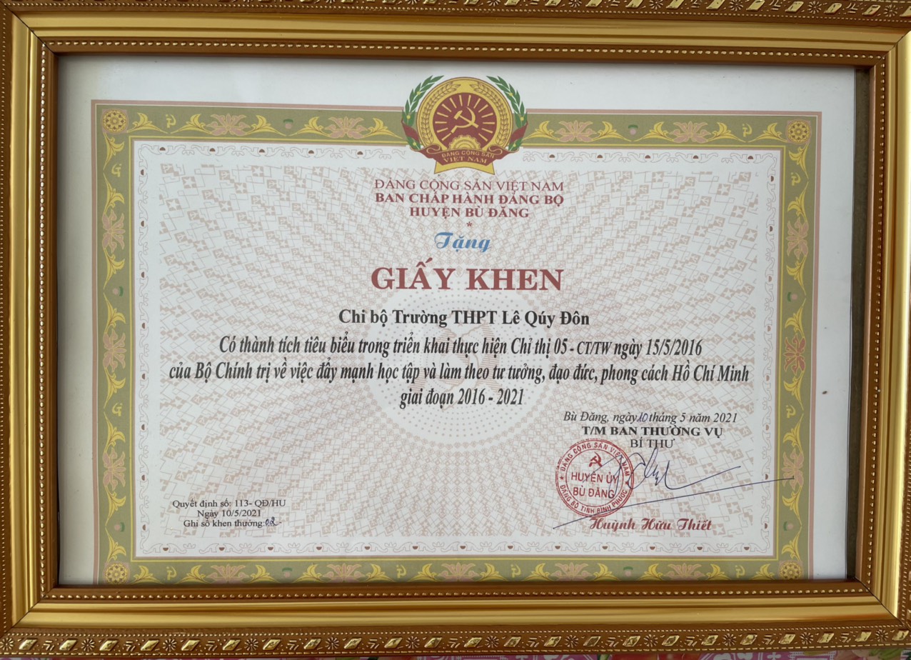 Năm 2021 là năm hết sức đặc biệt với chi bộ trường THPT Lê Quý Đôn, mặc dù gặp muôn vàn khó khăn do dịch bệnh covit-19 diễn biến rất phức tạp nhưng chi bộ nhà trường đã lãnh đạo các tổ chức, đoàn thể và bộ phận hoàn thành xuất sắc các chỉ tiêu đề ra như tỉ lệ học sinh đậu tốt nghiệp THPT 100%, Giáo viên giỏi cấp tỉnh đứng đầu trong toàn huyện (có 13 giáo viên đạt giáo viên giỏi cấp tỉnh), đứng nhì tỉnh ( Chỉ sau trường THPT Đồng Xoài). Công tác viết sáng kiến của nhà trường năm qua cũng đứng tốp đầu trong các trường THPT trong toàn tỉnh (có 39 sáng kiến đạt cấp Sở và 1 sáng kiến đạt cấp tỉnh), hội thao Giáo dục quốc phòng và an ninh (đạt 9 giải và 1 cờ đồng đội); số học sinh đạt giải trong các cuộc thi cấp tỉnh tăng nhiều so với năm 2020 (số giải học sinh giỏi cấp tỉnh tăng 2 giải, số học sinh tham gia cuộc thi thanh thiếu niên nhi đồng cấp tỉnh do sở khoa học công nghệ tổ chức đạt 3 giải (1 giải nhì, 1 giải Ba và 1 giải khuyến khích); Đoàn trường là đơn vị dẫn đầu về thi đua công tác đoàn trong toàn huyện; Công đoàn nhà trường được liên đoàn lao động tỉnh tặng Bằng khen trong công tác phòng chống dịch bệnh covit-19 (là đơn vi trường học duy nhất trong toàn tỉnh được tặng Bằng khen), … Những cố gắng không biết mệt mỏi của thầy và trò trường THPT Lê Quý Đôn đã được Ban thường vụ huyện ủy Bù Đăng ghi nhận và đánh giá rất cao, trong năm 2021 chi bộ nhà trường đã được BTV huyện ủy xếp loại hoàn thành xuất sắc nhiệm vụ là đơn vị trường học duy nhất trong toàn huyện được xếp loại xuất sắc. Bên cạnh đó chi bộ nhà trường còn tích cực vận động Các thầy cô giáo và các em học sinh tham gia tích cực các phong trào do Ban tuyên tuyên giáo tỉnh Ủy tổ chức như cuộc thi “Bình Phước 25 năm khát vọng vươn lên” nhân kỷ niệm 25 năm tái lập tỉnh (01/01/1997-01/01/2021). Cũng trong cuộc thi này trường THPT Lê Quý Đôn đã đạt được rất nhiều giải cá nhân và được ban tuyên giáo huyện ủy tuyên dương trước hội nghị tổng kết công tác tuyên giáo năm 2021 (là đơn vị duy nhất trong toàn huyện được Ban tuyên giáo huyện ủy tuyên dương) Trong hội nghị tổng kết công tác xây dựng Đảng năm 2021 do Ban tổ chức Huyện ủy tổ chức, chi bộ cũng được chọn tham gia tham luận trước toàn huyện về công tác kết nạp Đảng viên và xây dựng chi bộ trong sạch vững mạnh. T hội nghị sơ kết 5 năm thực hiện chỉ thị 05-CT/TW ngày 15/05/2016 của bộ chính trị 2016-2021 về việc học tập và làm theo tấm gương, đạo đức, phong cách Hồ Chí Minh, chi bộ trường THPT Lê Quý Đôn đã vinh dự được chọn là đơn vị trường THPT duy nhất trong toàn huyện được tuyên dương trong giai đoạn 2016-2021, đây là sự ghi nhận sứng đáng cho những cố gắng không biết mệt mỏi của toàn thể thầy và trò trường THPT Lê Quý Đôn trong giai đoạn 5 năm từ 2016 đến 2021.