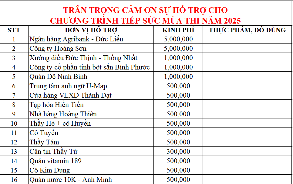 Hoạt động là một hành trình tình nguyện đầy ý nghĩa với sự tham gia hỗ trợ của các Cơ quan, doanh nghiệp, các mạnh thường quân, quý phụ huynh, giáo viên, cựu học sinh nhà trường về kinh phí cũng như các nhu yếu phẩm giúp cho các sĩ tử yên tâm, tự tin vượt qua kỳ thi tốt nhất. BCH Đoàn trường gửi lời cảm ơn sâu sắc tới các đơn vị, tập thể, cá nhân đã hỗ trợ và giúp chương trình “Tiếp sức mùa thi” diễn ra ý nghĩa và hiệu quả: