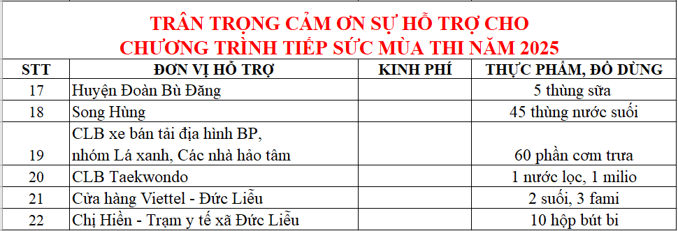 Trải qua 4 buổi của Đợt 1 và 4 buổi của Đợt 2 cùng với tinh thần xung kích của đoàn viên thanh niên nhà trường, đoàn viên thanh niên của các xã Đức Liễu, sự hỗ trợ nhiệt tình của các bạn tình nguyện viên cửa hàng Honda Head Song Hùng Bù Đăng đã giúp hỗ trợ cho gần 800 sĩ tử cũng như quý phụ huynh với số lượng nhu yếu phẩm, thực phẩm rất lớn