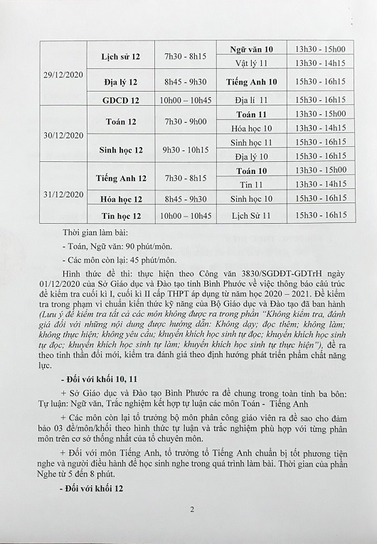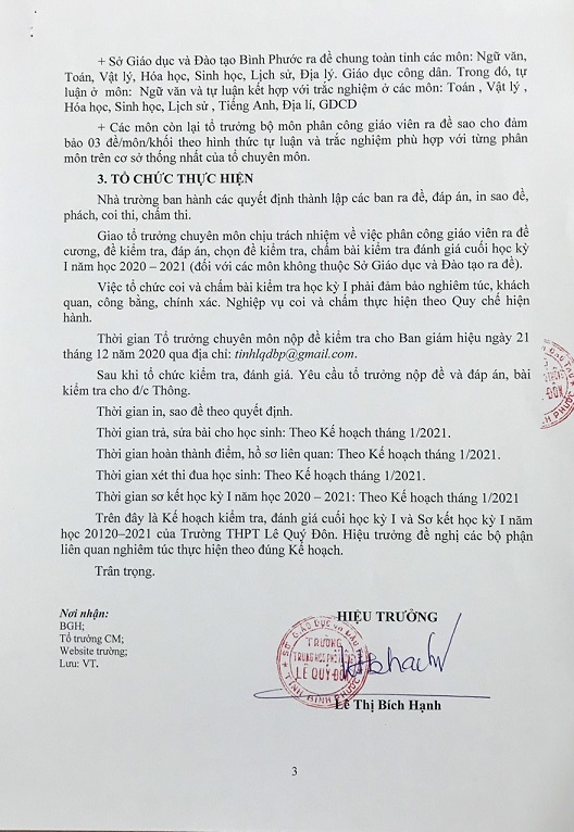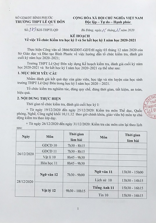 Kế hoạch tổ chức kiểm tra học kỳ và sơ kết học kỳ 1