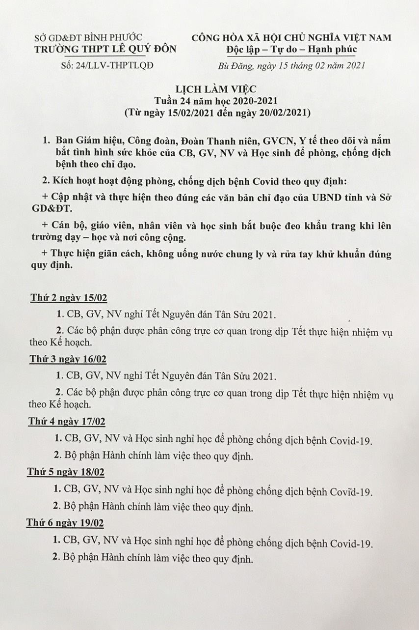 Lịch làm việc tuần 24 của cán bộ - giáo viên - nhân viên và đoàn thể