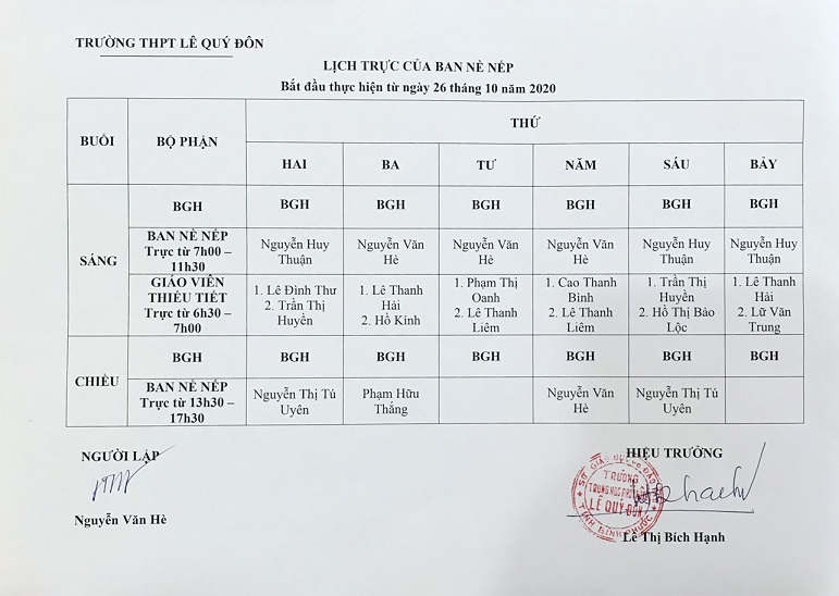 Lịch trực của Ban nề nếp bắt đầu từ ngày 26/10/2020