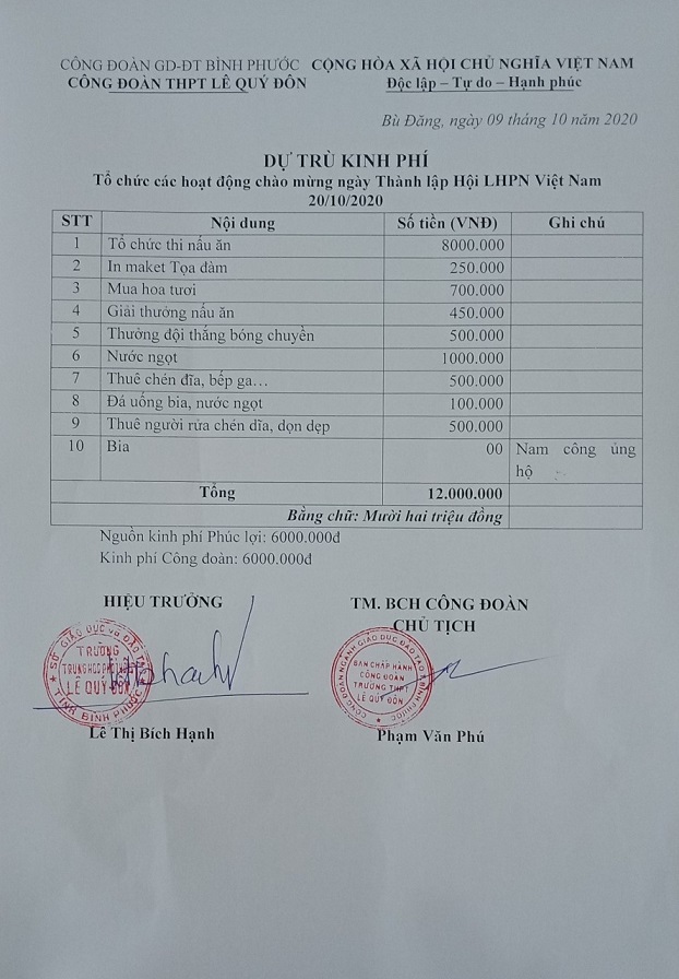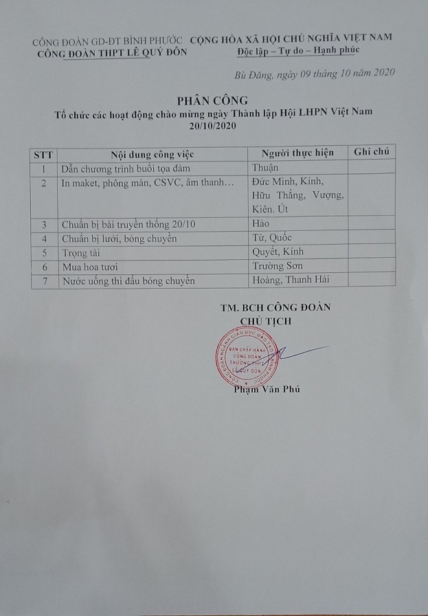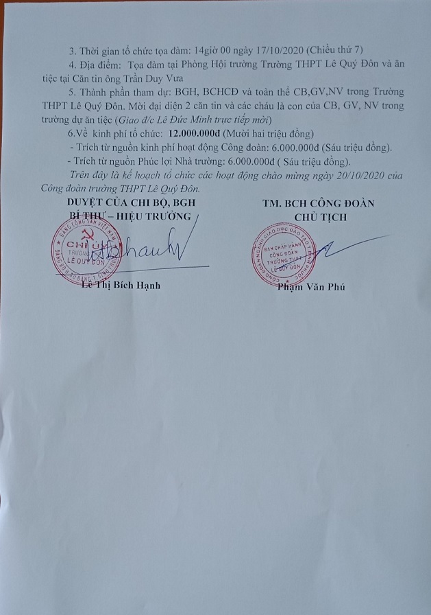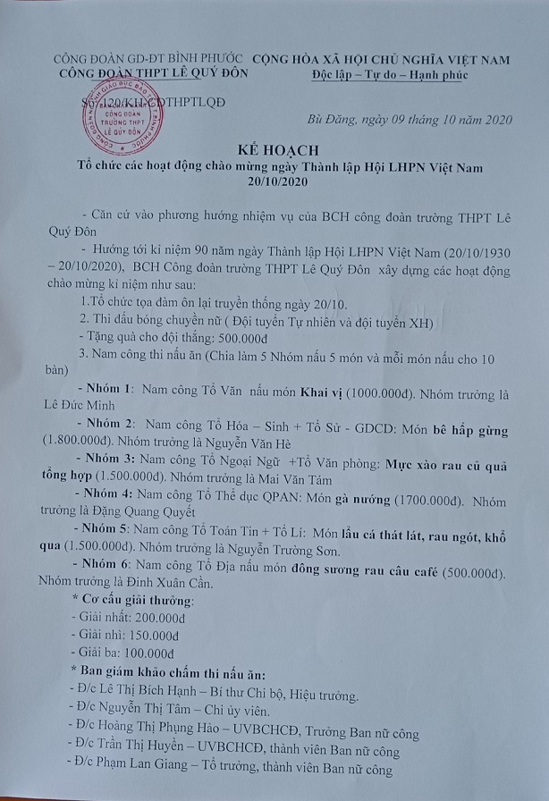 Số 129/KH-THPTLQĐ V/v Tổ chức các hoạt động chào mừng ngày Thành lập Hội LHPN Việt Nam 20/10/2020
