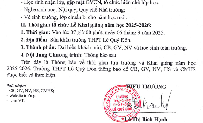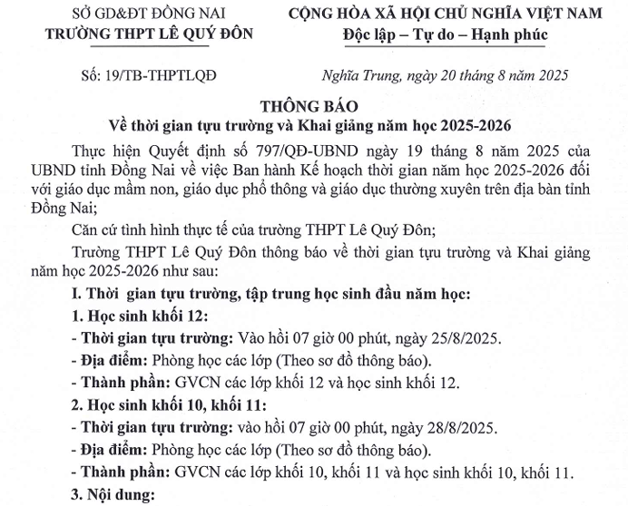 Số 19/TH - THPTLQD Thông báo về thời gian tựu trường và Khai giảng năm học 2025-2026