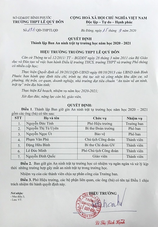 Số 191/QĐ-THPTLQĐ V/v thành lập Ban An ninh trật tự trường học năm học 2020-2021
