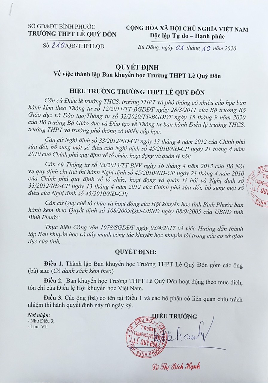 Số 210/QĐ-THPTLQĐ V/v thành lập ban khuyến học Trường THPT Lê Quý Đôn