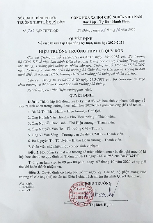 Số 216/QĐ-THPTLQĐ Thành lập hội đồng kỷ luật năm học 2020-2021