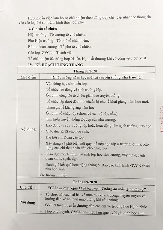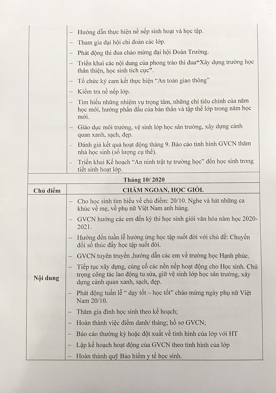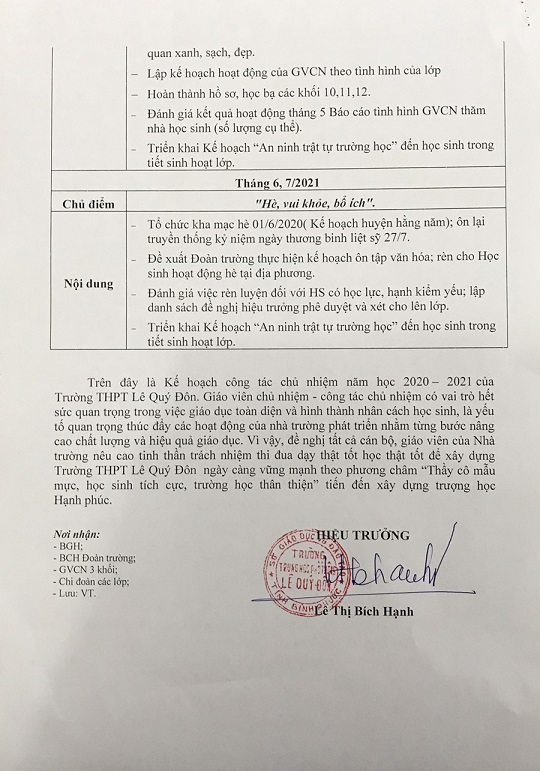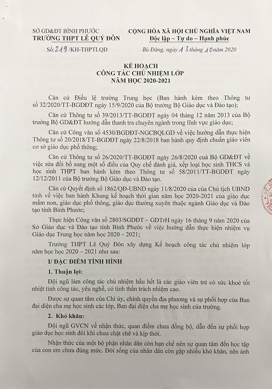 số 219/KH-THPTLQĐ Kế hoạch công tác chủ nhiệm lớp năm học 2020-2021