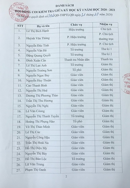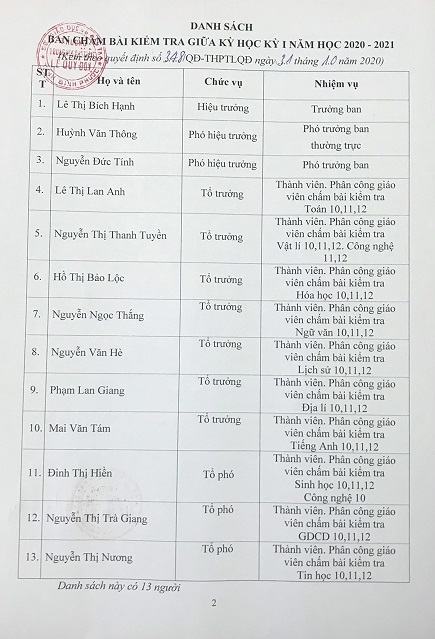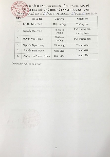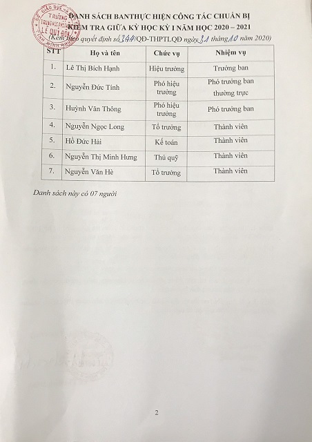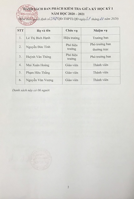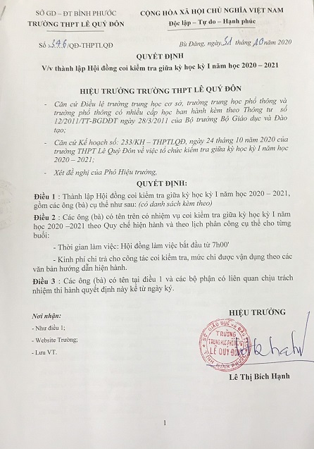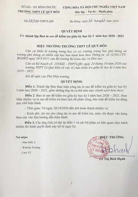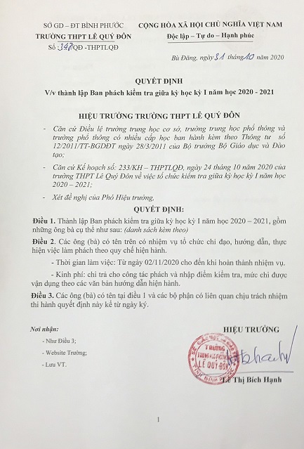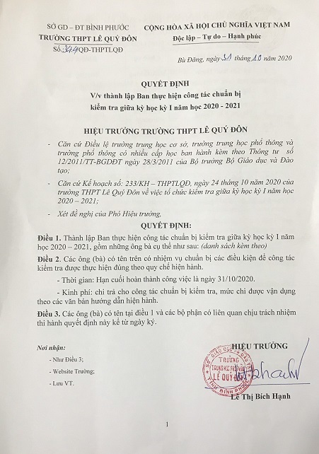 Số 344/QĐ-THPTLQĐ V/v thành lập Ban thực hiện công tác chuẩn bị kiểm tra giữa học kỳ 1 năm học 2020-2021