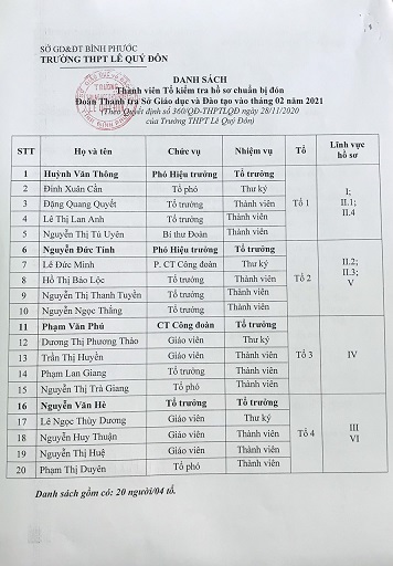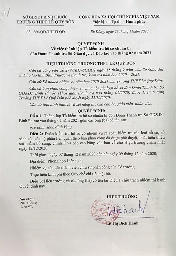Số 36QĐ-THPTLQD V/v Thành lập Tổ kiểm tra hồ sơ chuẩn bị đón đoàn kiểm tra Sở