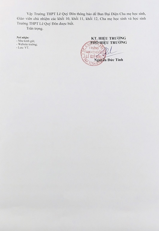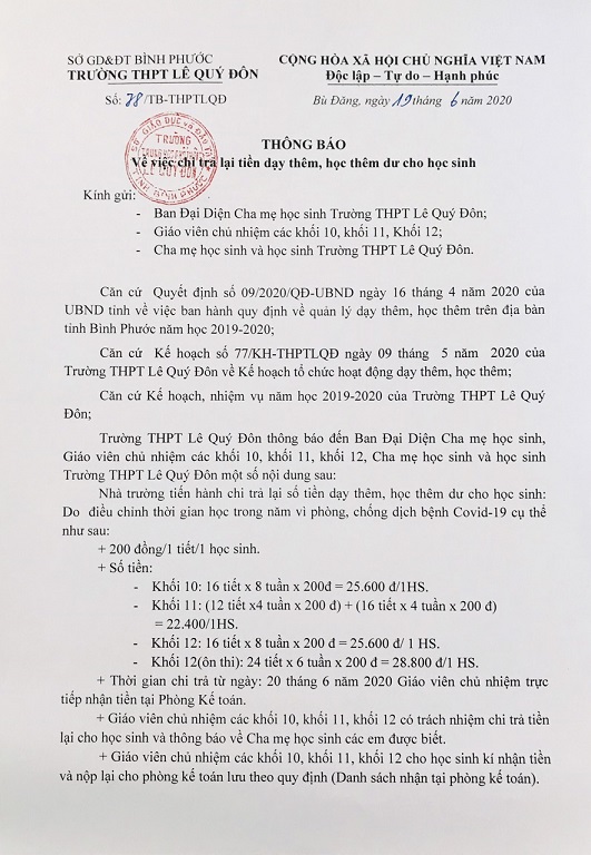 Số 78/TB-THPTLQĐ Thông báo về việc trả lại tiền dạy thêm, học thêm dư cho học sinh