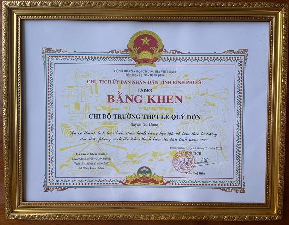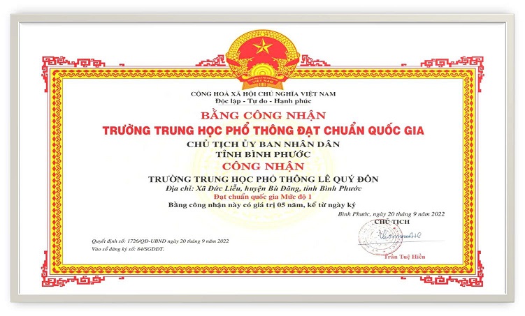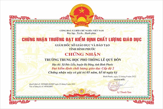 Năm học 2022-2023 trường được công nhận và cấp Chứng nhận đạt Kiểm định chất lượng giáo dục Cấp độ 2, chu kỳ đánh giá từ năm học 2017-2018 đến năm học 2021-2022 theo Quyết định số 2829/QĐ-SGDĐT ngày 22/9/2022 của Sở GD-ĐT Bình Phước. Đồng thời UNBD tỉnh Bình Phước đã ban hành quyết định số 1726/QĐ-UBND ngày 20/9/2022 công nhận và cấp bằng đạt chuẩn quốc gia mức độ 1 đối với Trường THPT Lê Quý Đôn.