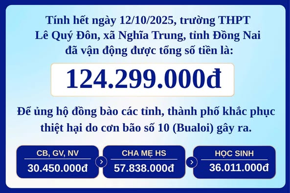 Tổng số tiền đã vận động được là 124.299.000đ (Một trăm hai mươi tư triệu hai trăm chín mươi chín ngàn đồng) trong đó có 3 thầy cô chuyển khoản trực tiếp vào tài khoản của UBMTTQVN, nhà trường đã chuyển toàn bộ số tiền còn lại vào tài khoản của UBMTTQVN tỉnh Đồng Nai để có thể gửi đến tay đồng bào miền Bắc và miền Trung thân yêu.
